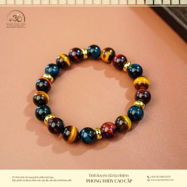 Là sự kết hợp của ba gam màu: vàng - nâu - xanh, tạo nên hiệu ứng thị giác bắt mắt và hài hòa. Trong phong thủy, “tam tài” tượng trưng cho thiên - địa - nhân, mang ý nghĩa cân bằng giữa trí tuệ, sức mạnh và may mắn. Vòng tay đá mắt hổ tam tài này phù hợp với người muốn tìm kiếm sự ổn định toàn diện về công việc, sức khỏe và các mối quan hệ.
