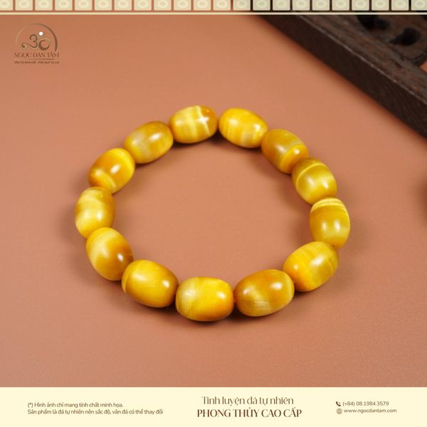 Đây là dòng phổ biến và được ưa chuộng nhất nhờ màu vàng kim rực rỡ, dễ phối trang phục và mang lại cảm giác ấm áp. Khi chế tác thành vòng tay đá phong thủy, mắt hổ vàng thường có 3 kiểu hạt chính: