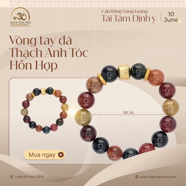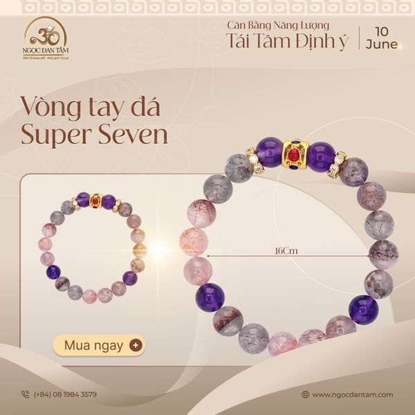 Phiên bản vòng tay Super Seven của Ngọc Đan Tâm được tuyển chọn từ đá tự nhiên chuẩn cấp 5A, kết hợp charm vàng mạ cao cấp đính đá đỏ chủ đạo – tượng trưng cho trung tâm quyền lực và sức sống.