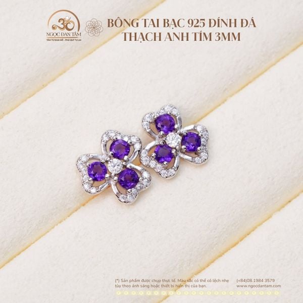 Bông Tai Bạc 925 Đính Đá Thạch Anh Tím 3mm