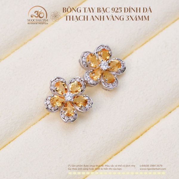 Bông Tai Bạc 925 Đính Đá Thạch Anh Vàng 3x4mm
