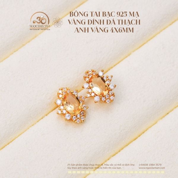 Bông Tai Bạc 925 Mạ Vàng Đính Đá Thạch Anh Vàng 4x6mm