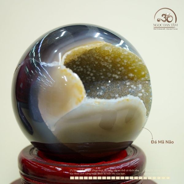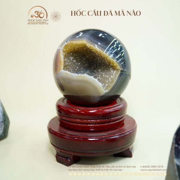 Hốc Cầu Đá Mã Não là sự kết hợp hài hòa giữa hình dáng cầu tròn hoàn chỉnh và phần hốc tinh thể tự nhiên nằm sâu bên trong lòng đá. Lớp vỏ mã não mượt mà bao bọc các tinh thể lấp lánh tạo nên chiều sâu thị giác độc đáo, mang vẻ đẹp vừa mạnh mẽ vừa trầm tĩnh.