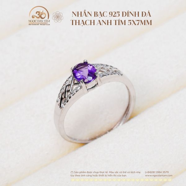 Nhẫn Bạc 925 Đính Đá Thạch Anh Tím 5x7mm