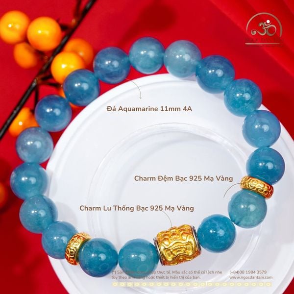 Vòng Tay Aquamarine 11mm 4A Phối Charm Lu Thống Tỳ Hưu