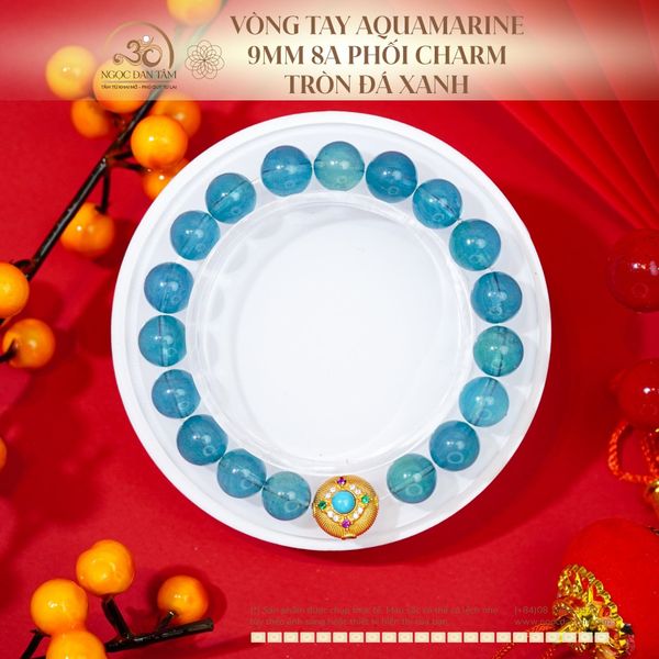 Vòng Tay Aquamarine 9mm 8A Phối Charm Tròn Đá Xanh