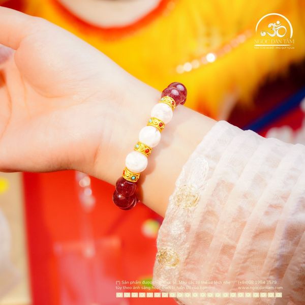 Vòng Tay Dâu Tây 11mm 5A Phối Thạch Anh Hoa Tuyết 11mm