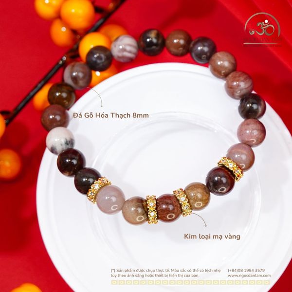 Vòng Tay Gỗ Hóa Thạch 8mm Phối Charm Cỏ Bốn Lá Mạ Vàng