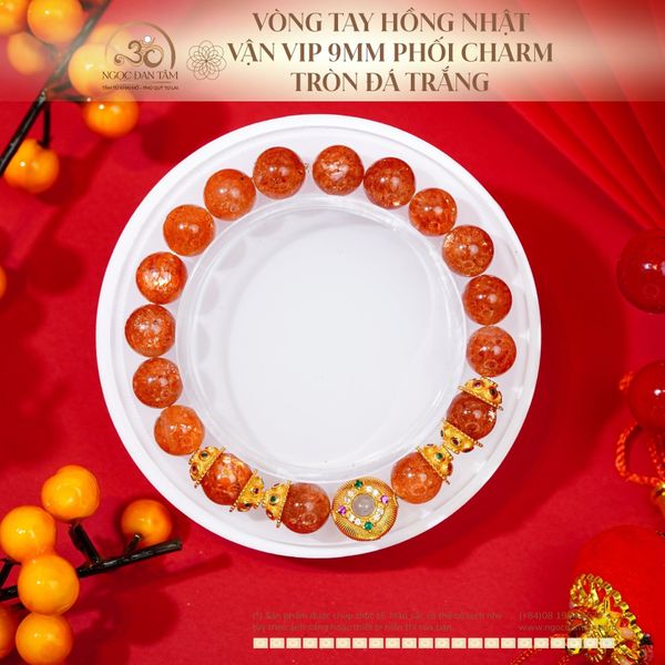 Vòng Tay Hồng Nhật Vận Vip 9mm Phối Charm Tròn Đá Trắng