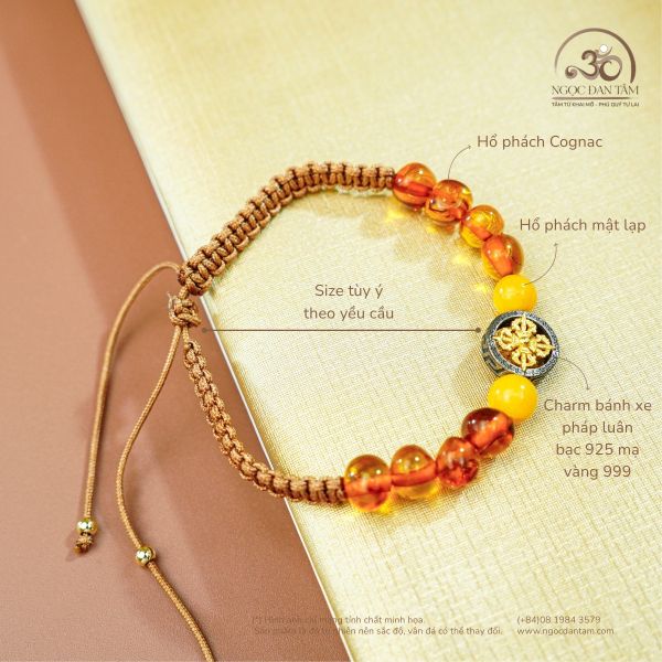 Hổ Phách - Sức mạnh cổ đại - Được hình thành từ nhựa thông hóa thạch hơn 40 triệu năm, Hổ Phách mang trong mình trường năng lượng cổ xưa giúp: Thanh lọc cảm xúc Giảm stress & hỗ trợ giấc ngủ Tạo lớp bảo vệ tinh thần - Màu Cognac đậm sắc trầm của hổ phách tượng trưng cho sự vững vàng, trong khi Mật Lạp vàng sáng đem lại niềm vui & sức sống. - Charm Bánh Xe Pháp Luân - Dẫn đường tỉnh thức Biểu tượng cổ đại này đại diện cho: Bát Chính Đạo - con đường giác ngộ trong Phật giáo Vòng xoay liên tục của nhân - quả - nghiệp - duyên Tinh thần “Kim Cang” vững chãi, không lay chuyển Bánh xe xoay nhẹ như nhắc nhở ta: mọi chuyển động trong cuộc sống đều có ý nghĩa, chỉ cần đủ tỉnh thức để nhận ra.