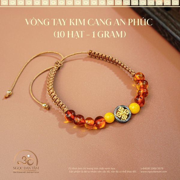 Vòng Tay Kim Cang An Phúc là một sáng tạo mang hơi thở thiền định, tinh thần Phật giáo và vẻ đẹp năng lượng từ thiên nhiên. Chiếc vòng là sự giao hòa của: Hổ phách Cognac: cổ kính, thuần khiết Mật Lạp: sáng rực, mang nguồn dương khí Charm Bánh Xe Pháp Luân: biểu tượng của trí tuệ và con đường tỉnh thức