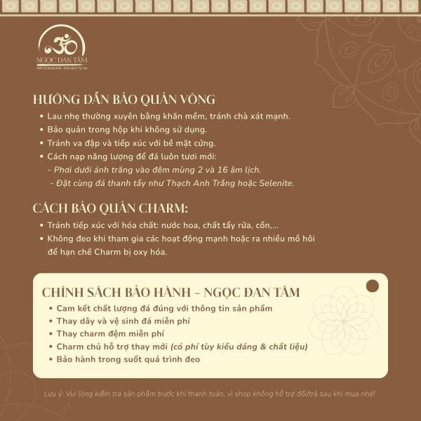 - Thanh Tẩy Năng Lượng Định Kỳ: Thanh tẩy năng lượng tiêu cực của sản phẩm sau thời gian 3-6 tháng (có thể đến trực tiếp showroom để nhân viên thanh tẩy miễn phí hoặc yêu cầu để được gửi cách thanh tẩy tại nhà).