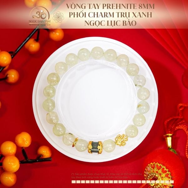 Vòng Tay Prehnite 8mm Phối Charm Trụ Xanh Ngọc Lục Bảo