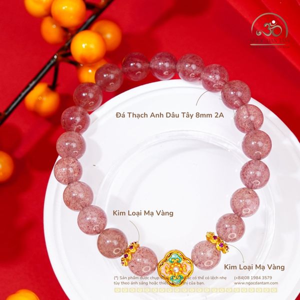 Vòng Tay Thạch Anh Dâu Tây 8mm 2A Phối Charm Bướm Ren Đính Ngọc Trai