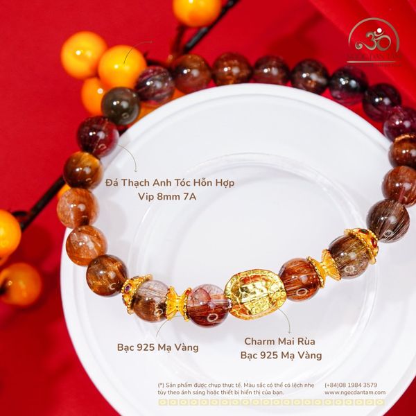 Vòng Tay Thạch Anh Tóc Hỗn Hợp Vip 8mm 7A Phối Charm Mai Rùa