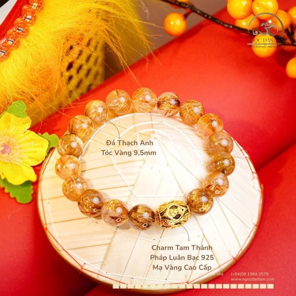 Vòng Tay Thạch Anh Tóc Vàng 9,5mm Phối Charm Tam Thánh Pháp Luân