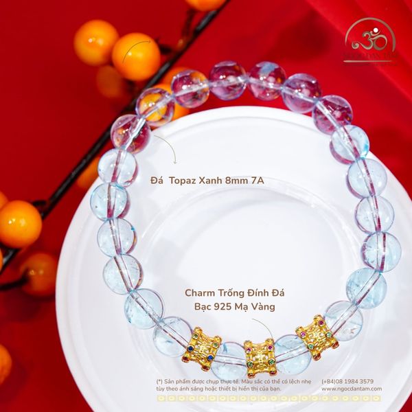 Vòng Tay Topaz Xanh 8mm 7A Phối Charm Trống Đính Đá