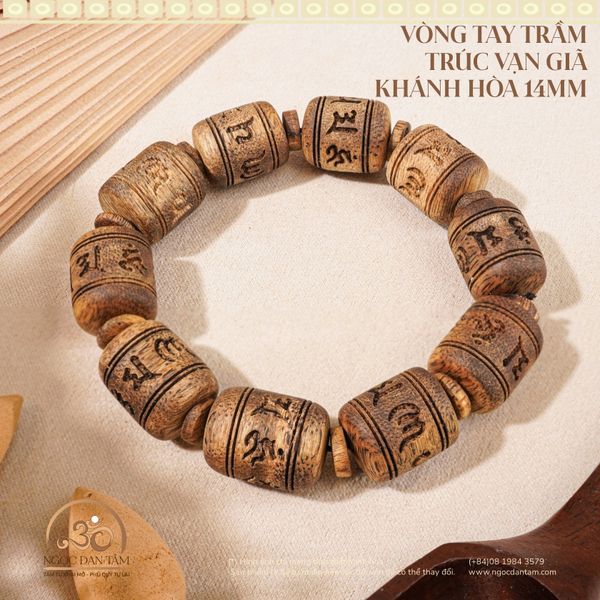 Vòng Tay Trầm Trúc Vạn Giã Khánh Hòa 14mm là sự kết hợp hoàn hảo giữa trầm tự nhiên quý hiếm và chữ khắc Lục Tự Đại Minh Chú - thần chú Om Mani Padme Hum linh thiêng trong truyền thống Phật giáo Tây Tạng. Mỗi hạt trầm đều được tạo hình như trúc ống, khắc tay tỉ mỉ và đều đặn, mang lại vẻ đẹp mộc mạc nhưng sâu sắc, như một hành trình tu tập qua từng khúc quanh của đời sống.