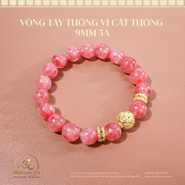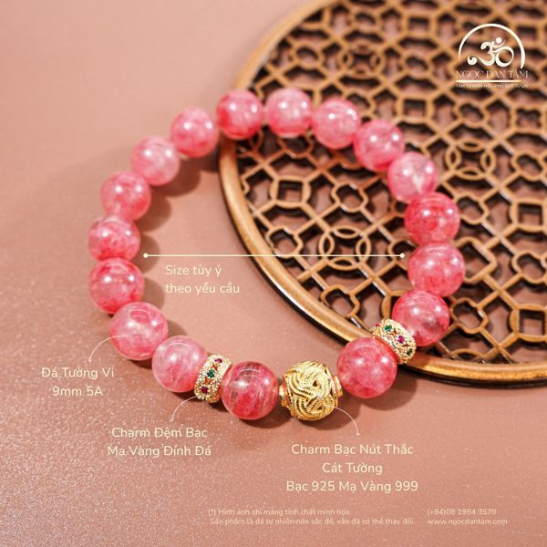 Vòng Tay Tường Vi Cát Tường 9mm được chế tác từ đá Tường Vi thiên nhiên loại 5A cao cấp, có sắc hồng rực rỡ và trong trẻo, tượng trưng cho tình yêu, sự may mắn và hạnh phúc viên mãn. Kết hợp cùng charm bạc nút thắt Cát Tường và charm tròn đính đá tinh xảo, sản phẩm mang lại vẻ đẹp thanh lịch, sang trọng và giàu ý nghĩa phong thủy.